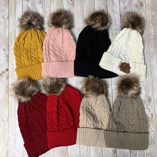 | Hat Style Knit | Green / Grey Stripes, Fur Pom Black, Fur Pom Cream, Fur Pom Rose, Fur Pom Mustard, Fur Pom Dk Beige, Fur Pom Lt Beige, Fur Pom Red, Fur Pom Dk Red, Basic Black, Basic Cream, Basic Grey, Basic Green |