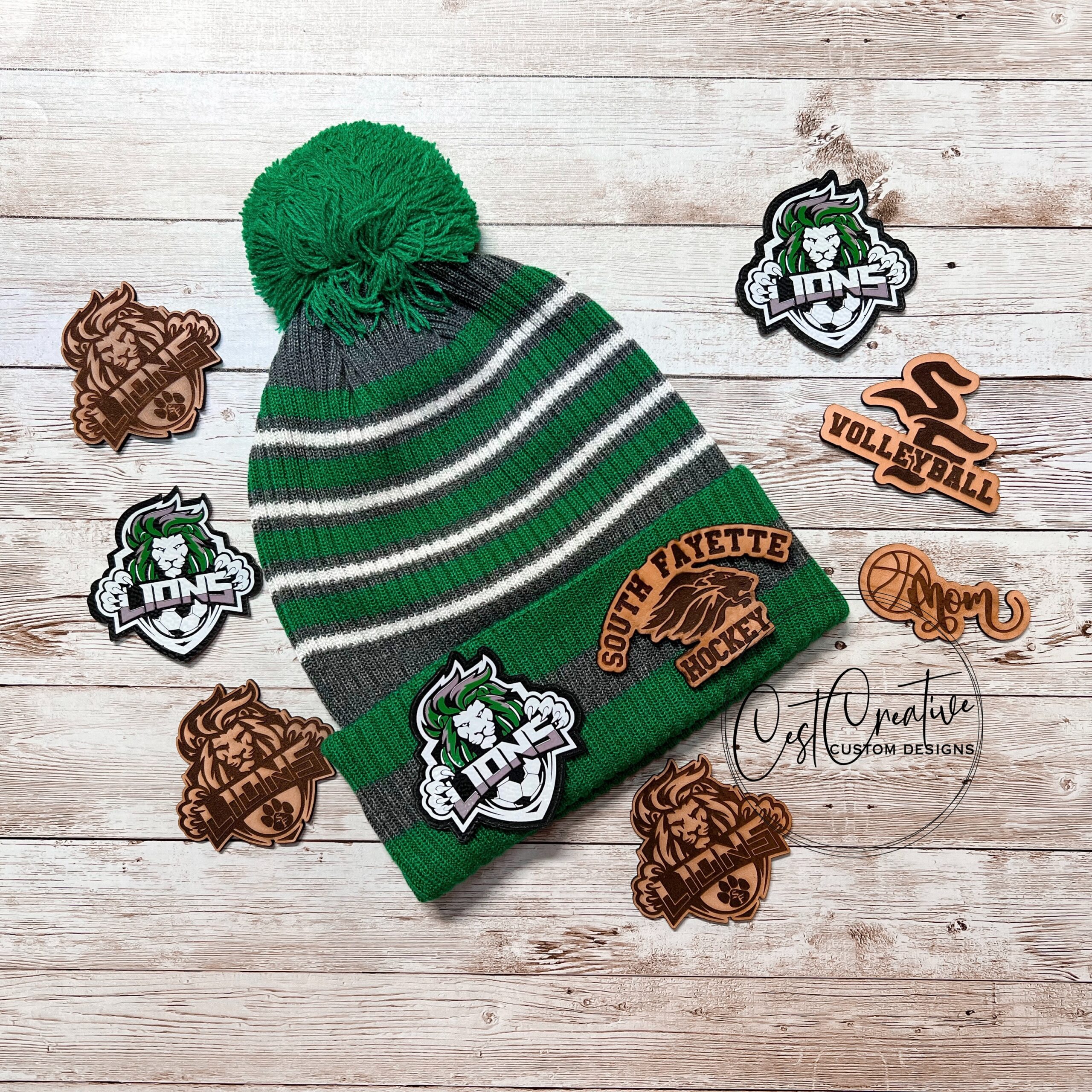Tags accessories, beanie, custom, hat, knit hat, leather, lions, skull cap, South Fayette, spirit, toboggan