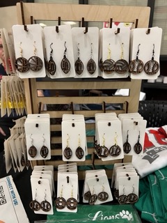 Laser cut wood earrings with engraved team names.